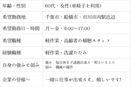 合同会社縁人(柏明原事業所)に通所されている障がいをお持ちの方(利用者様)の障がい者採用を検討していただける企業様を募集しております。